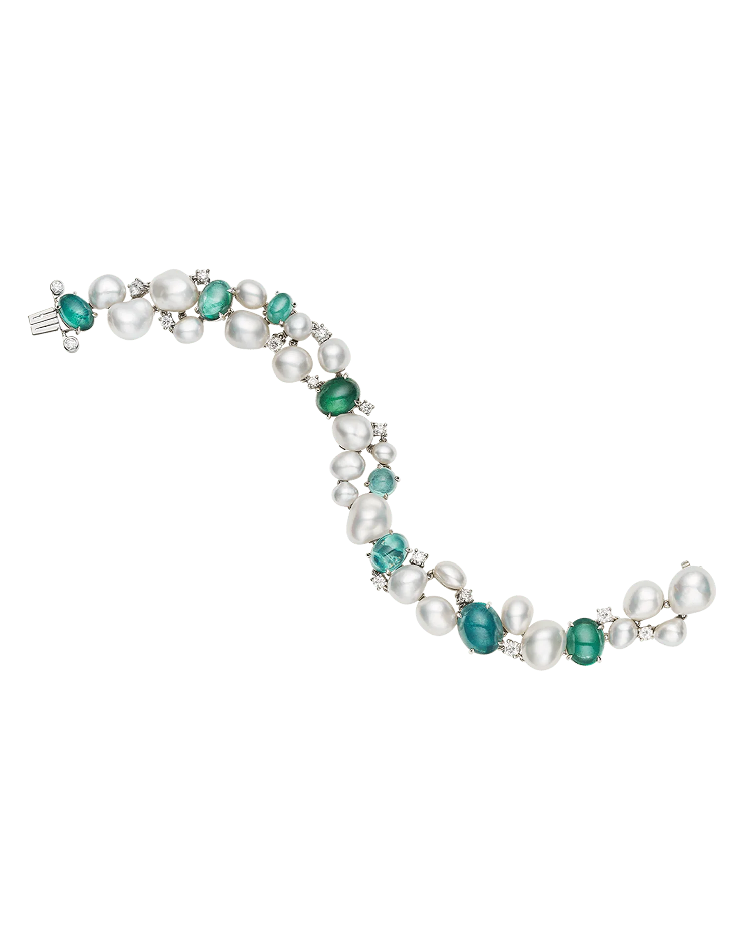 The Rockpool Pebble Bracelet features a pebble design developed to express how the shallow waters of the Australian coast are teeming with life and colour. This one-of-a-kind bracelet features Paspaley Keshi Baroque Pearls with tourmalines and white diamonds set in platinum.