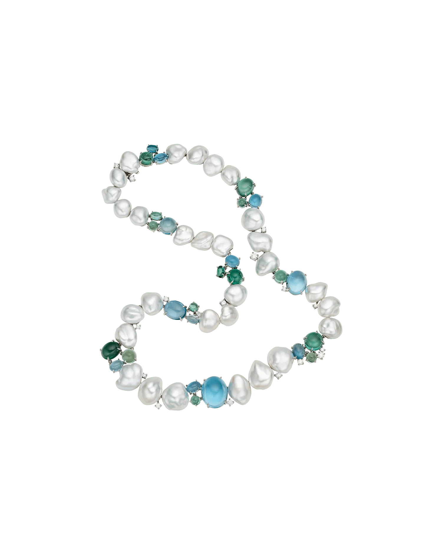 The Rockpool Aquamarine Necklace pays tribute to the sea and the natural world. An elegant statement this one-of-a-kind necklace features Paspaley Keshi Baroque Pearls with tourmalines, aquamarines and white diamonds set in platinum.